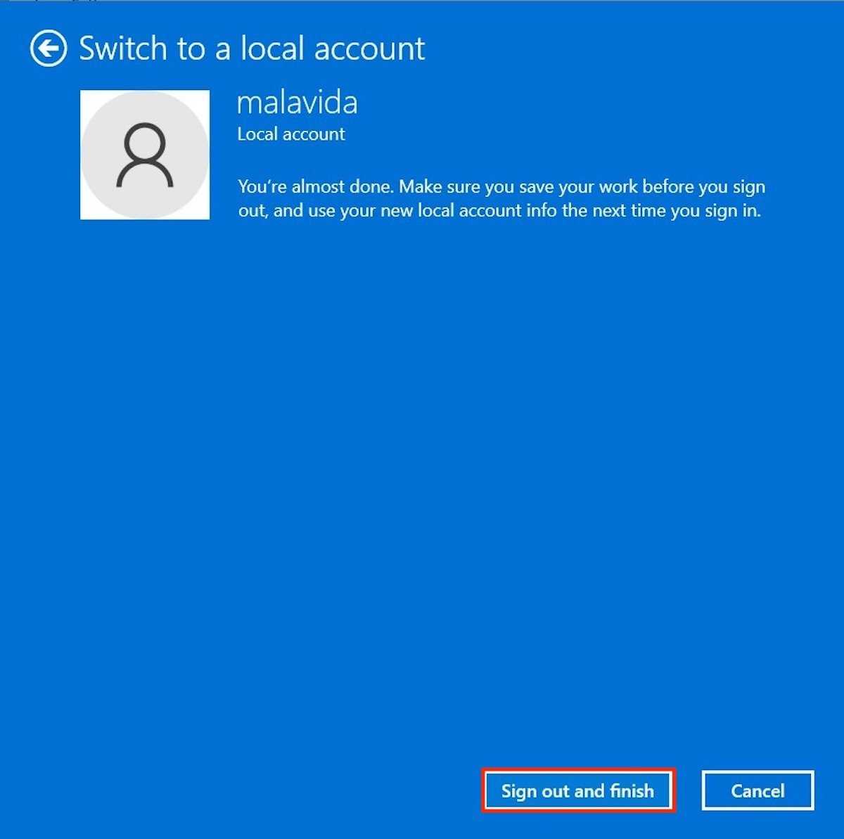 And that is it. You have already removed the Microsoft account from your computer. You now have a local user that is not linked to the online services integrated with Windows. The last step is to click on Sign out and finish. Your session will be closed and you will have to log in with your new password.