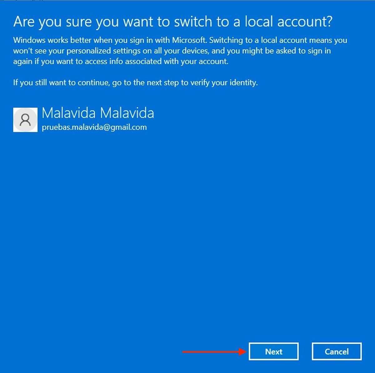 - Подтвердите переключение на локальную учетную запись, нажав «Далее».