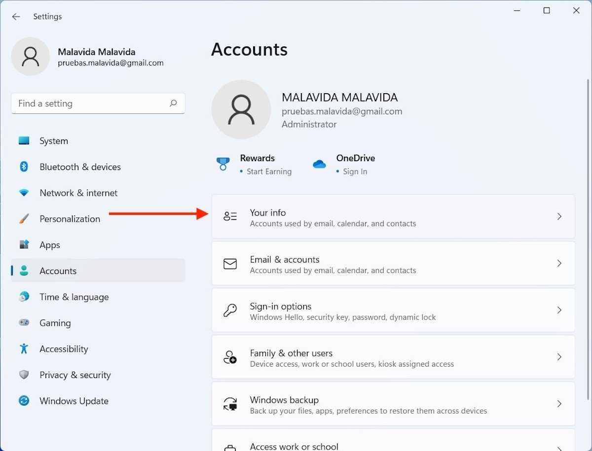 Again, it all starts in the settings application. Open Accounts and click on Your info.