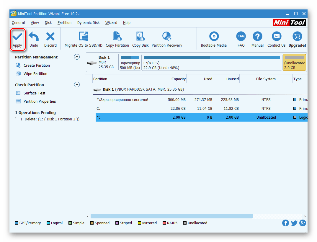 Все действия в этих программах можно осуществить с помощью основных и контекстных меню в интерфейсе с последующим нажатием кнопки «Применить» (Apply). К сожалению, большинство интересных функций (наподобие конвертации расширенного раздела в основной) заблокированы в бесплатных версиях, но простое удаление разделов работает.