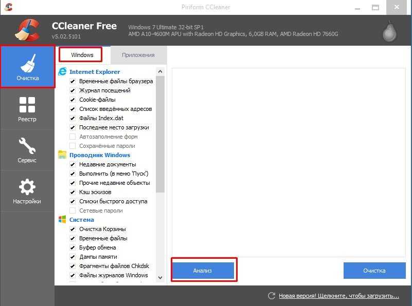 Теперь можно немного расслабиться, дальше за нас будет работать программа по автоматической очистке. Называется она Ccleaner, как правильно ее скачать и откуда, вы можете прочитать в статье, как почистить реестр компьютера . После того, как вы ее установили, запускаем. Нажимаем на раздел очистка, выбираем сначала рубрику Windows и только после этого нажимаем кнопку анализ.