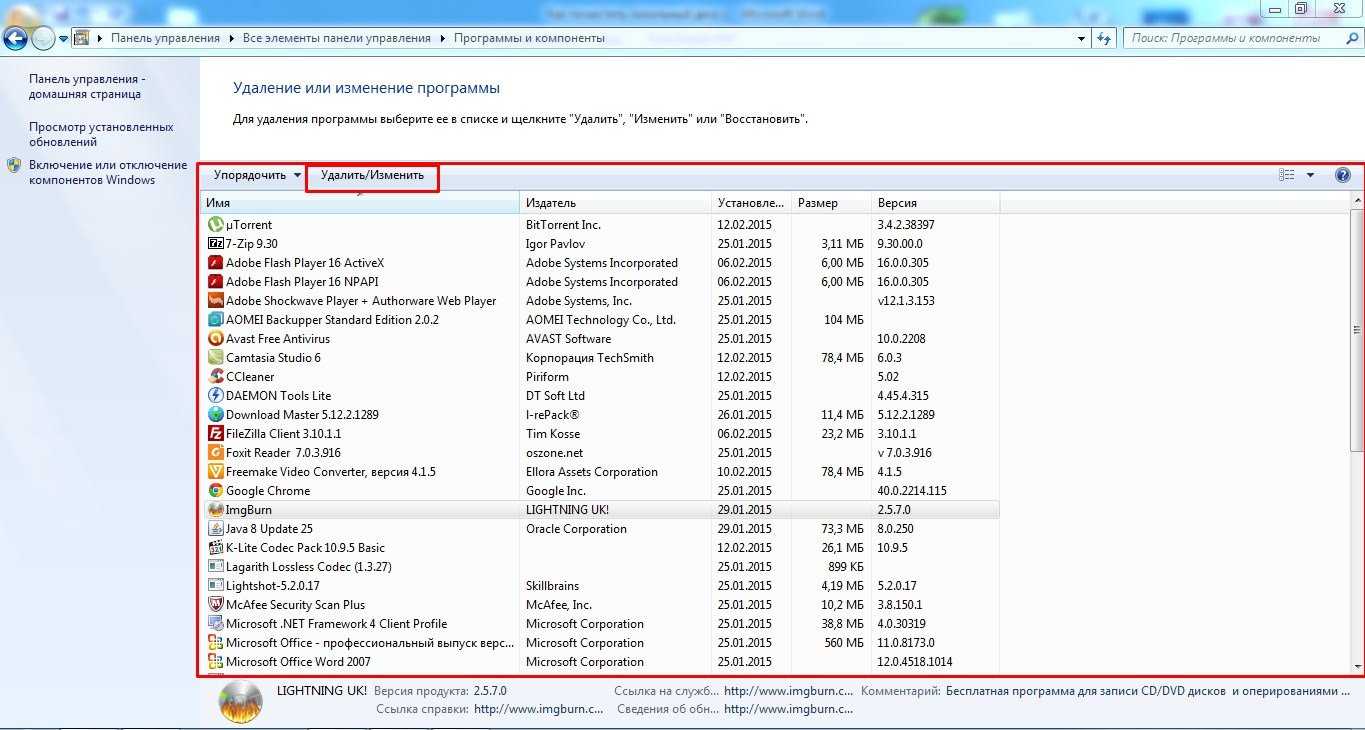 Находим ненужные нам программы в этом окне, выбираем их и нажимаем сверху на кнопку удалить/изменить так по очереди с каждым ненужным приложением или игрой. Данный процесс тоже почистит память локального диска С.