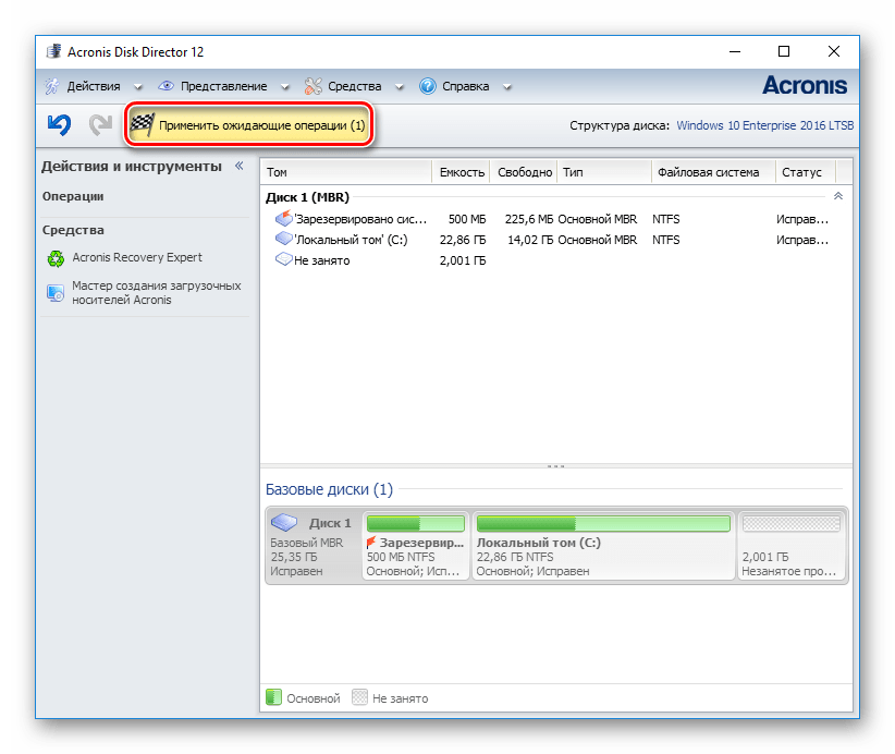 Чтобы удалить разделы диска, великолепно подходит набор инструментов Акронис. В его функциях есть восстановление дисков и флешек, но нужный нам инструмент тоже имеется. Если вы ей пользовались для каких-либо нужд, то используйте и сейчас. Недостаток один – утилита платная, поэтому лучше используйте иной способ, если не имеете бесплатной версии или лицензии. Действия следующие: