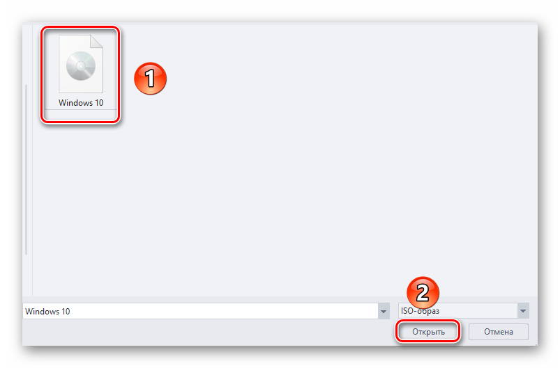 В открывшемся окне перейдите в папку, в которой хранится необходимый образ. Выделите его и нажмите кнопку «Открыть».