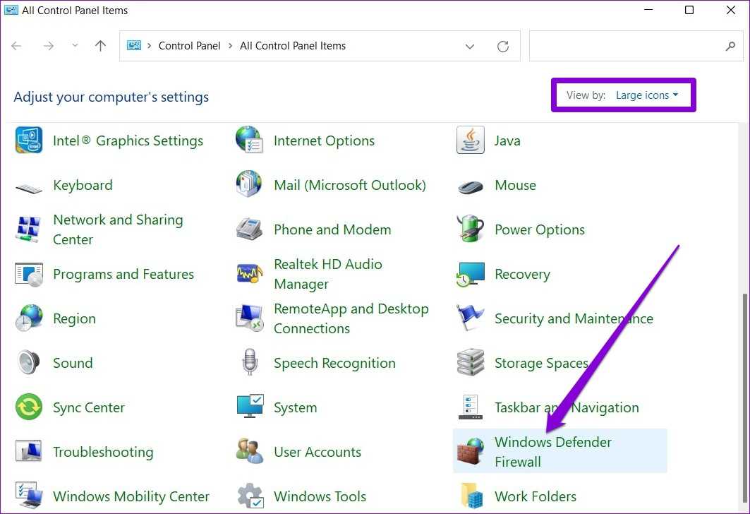 Шаг 2: Переключите тип представления на Крупные значки и выберите Брандмауэр Защитника Windows.