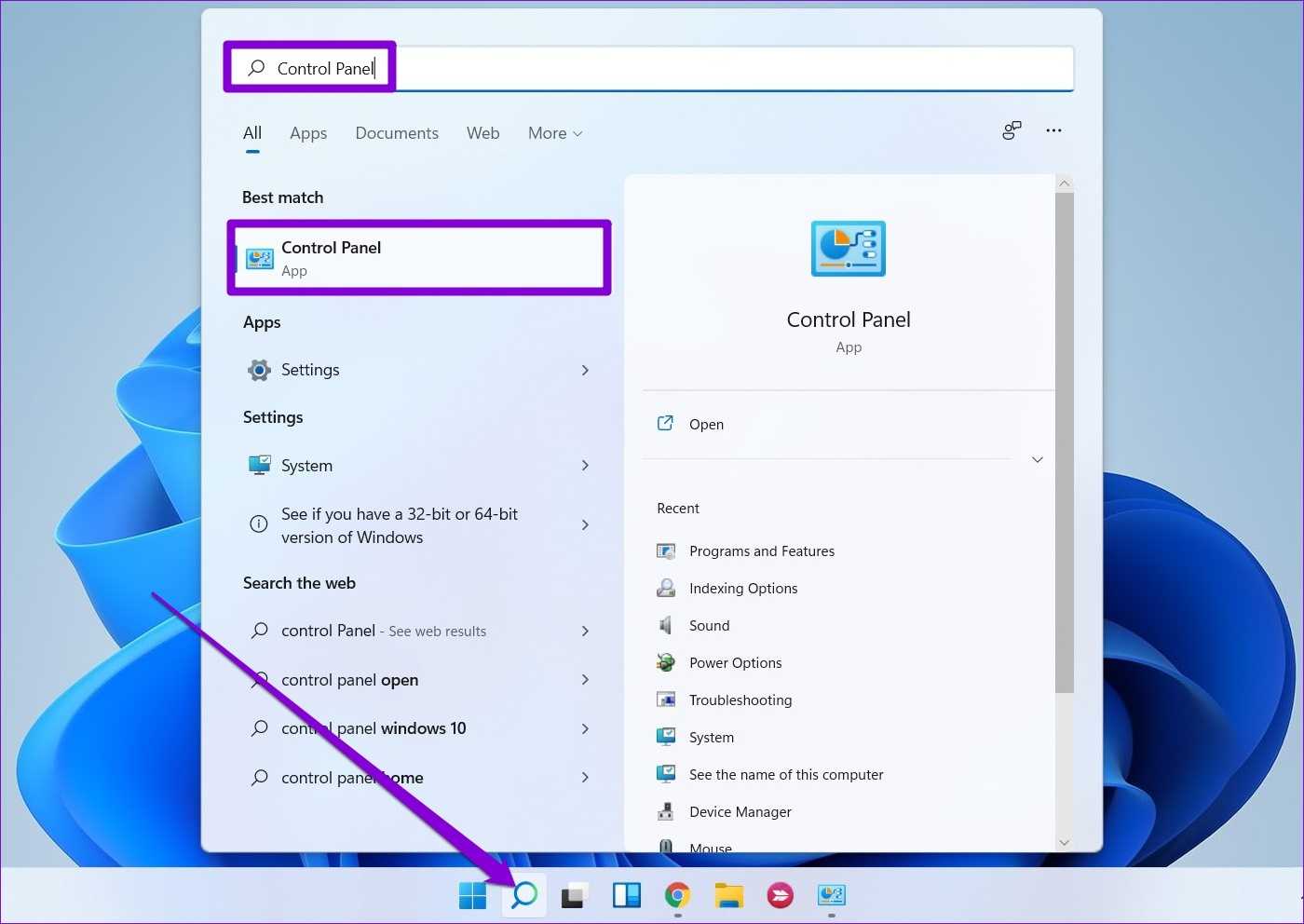 Шаг 1: Нажмите клавишу Windows + S, чтобы открыть меню поиска. Тип панель управления в поле и нажмите Enter.