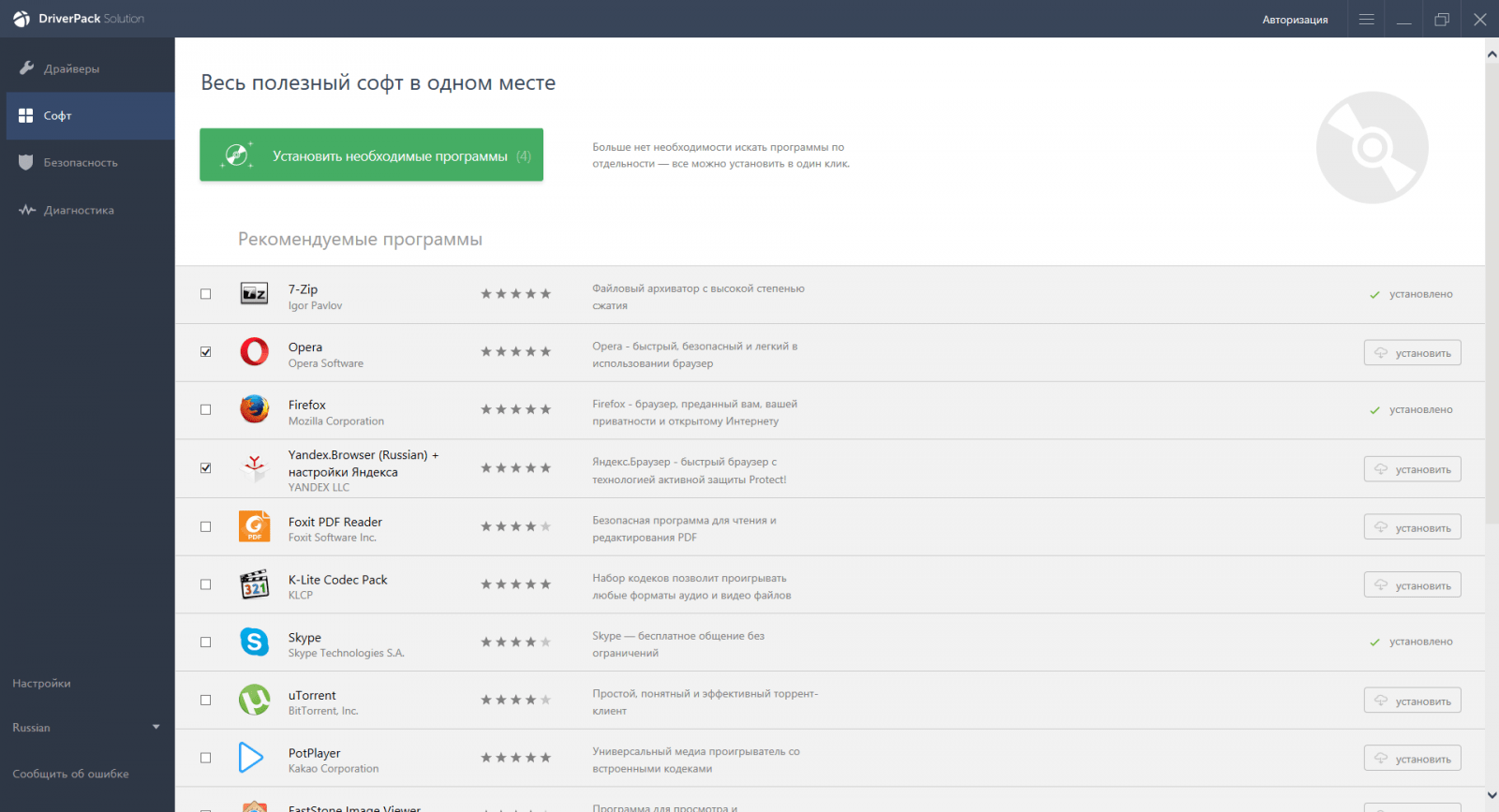 Для установки или обновления драйверов отмечаем их галочками и жмём кнопку «Установить». Перед установкой можете создать точку восстановления.