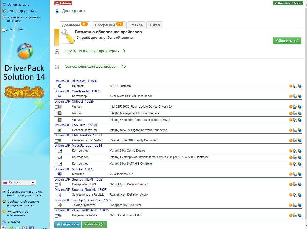 Данная утилита, проанализирует все железо, что у вас есть, благо BIOS знает его. Далее нажимаем снизу выбрать все, единственное замечу что если у вас стационарный компьютер и вам предлагается установить драйвер на тач пад, то снимите эту галку.