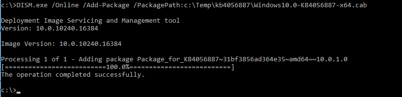 Deployment Image Servicing and Management toolVersion: 10.0.10240.16384Image Version: 10.0.10240.16384Processing 1 of 1 — Adding package Package_for_KB4056887~31bf3856ad364e35~amd64~~10.0.1.0The operation completed successfully.