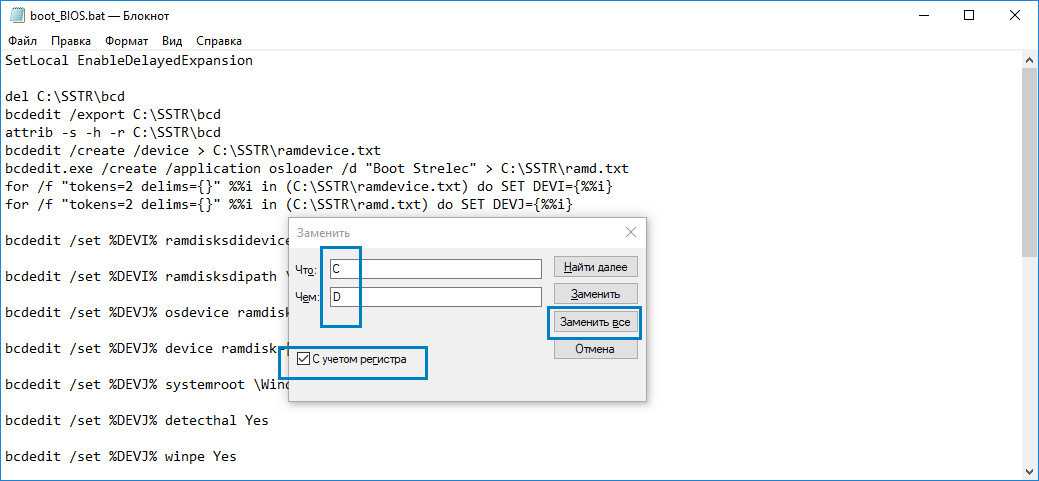 Если буква тома со скопированной в него папкой SSTR отличается от показанной на скриншоте, укажите свою и выполните замену буквы С, не забыв установить птичку в чекбоксе «С учетом регистра». Сохраните скрипт и запустите от имени администратора.