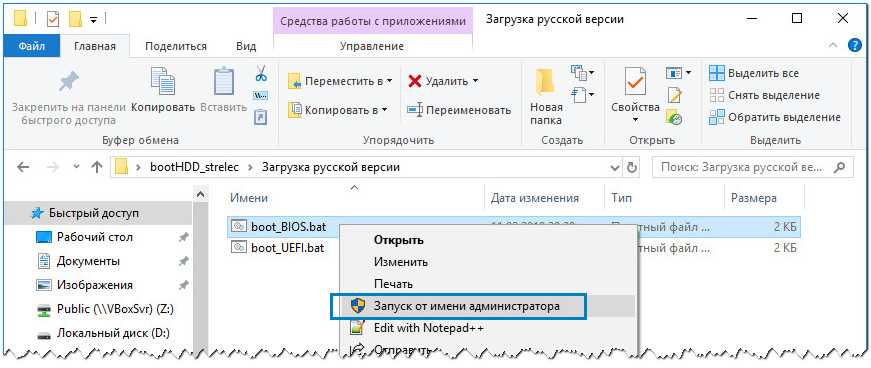 Затем распакуйте скачанный архив «bootHDD_strelec.rar», перейдите в папку «Загрузка русской версии» и запустите от имени администратора командный файл boot_BIOS.bat, если у вас обычный BIOS или boot_UEFI.bat, если у вас новый BIOS UEFI.