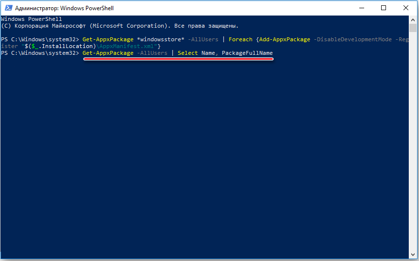 После, итоговый вариант нужно добавить в PowerShell и нажать Enter. Как правило, через несколько секунд магазин будет переустановлен.
