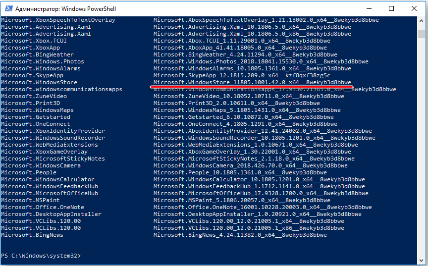Найти в открывшемся списке приложений строчку: «Name: Microsoft.Windows Store».