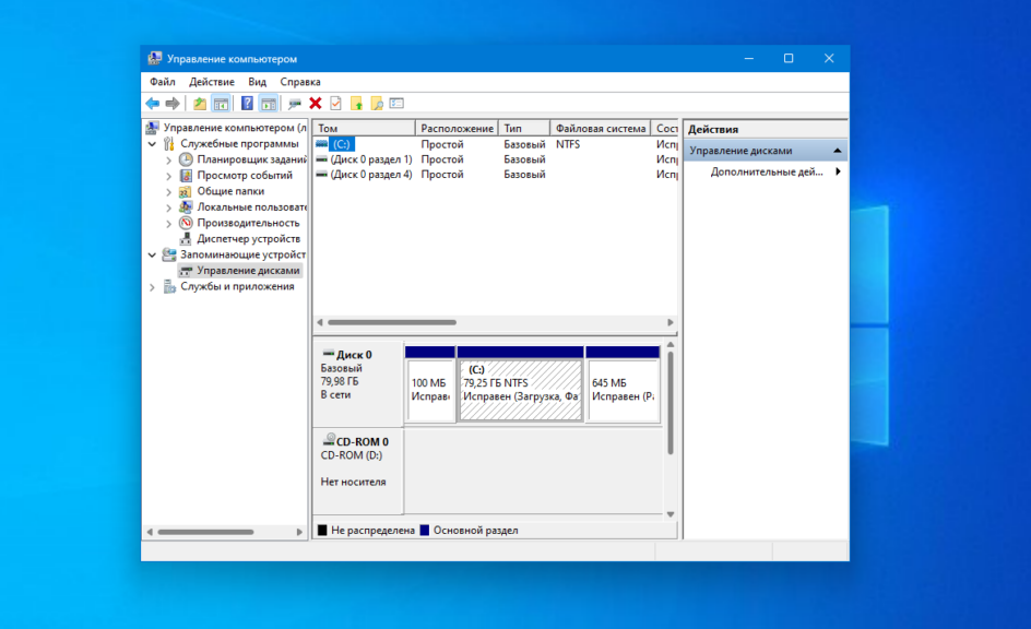 На этом компьютере имеется один жесткий диск, который обозначен, как «Диск 0» и оптический CD/DVD привод, под именем «CD-ROM 0». На жестком диске имеется системный раздел: диск «C:» и служебные разделы, необходимые для работы операционной системы, созданные автоматически при установке Windows.