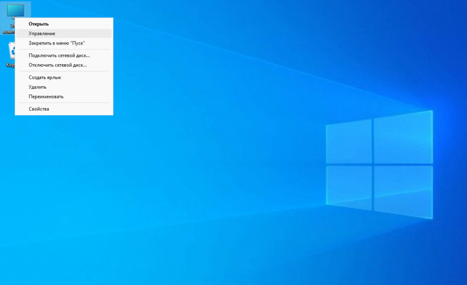 Кликните правой кнопкой по значку «Этот компьютер» на рабочем столе и откройте пункт «Управление»: