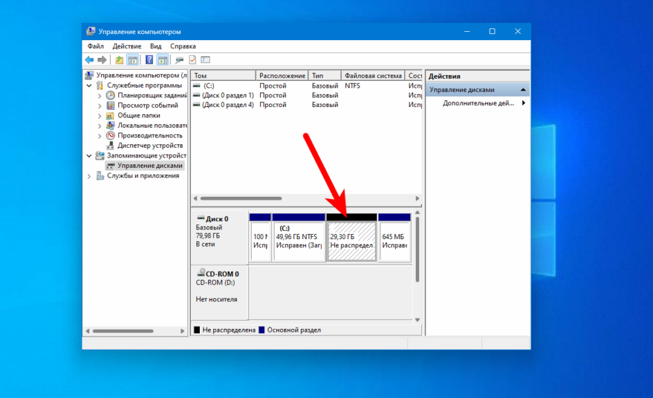 - В оснастке «Управления дисками появится нераспределенное пространство.
