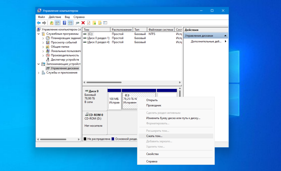 Кликните по нужному диску правой кнопкой и выберите опцию Сжать том: