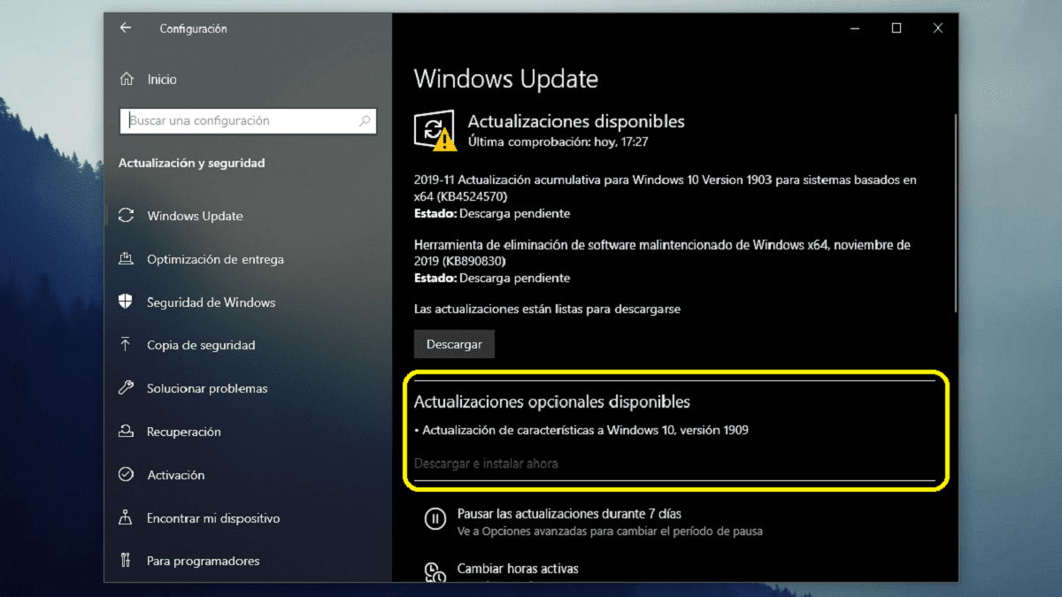 Вы получите прямой доступ к настройкам Центра обновления Windows, где внизу должно появиться предупреждение, указывающее, что есть доступны некоторые дополнительные обновления. В этом случае новая версия должна появиться у вас под именем «Обновление компонентов до Windows 10 версии 1909». Вам просто нужно нажать кнопку, которая появляется ниже, чтобы позаботиться о скачать и установить новую версию как обновление нормальная система.