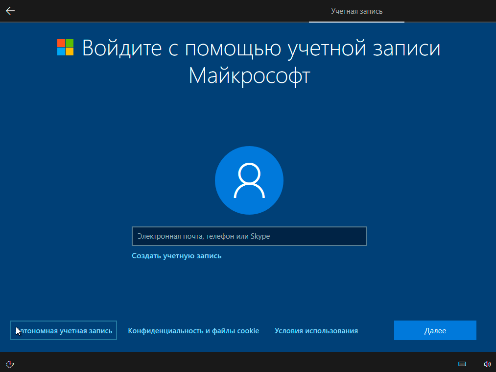 Если же учётной записи Microsoft у вас нет, и вы не хотите её создавать, выбираем снизу “автономная учётная запись” И нажимаем “Далее”