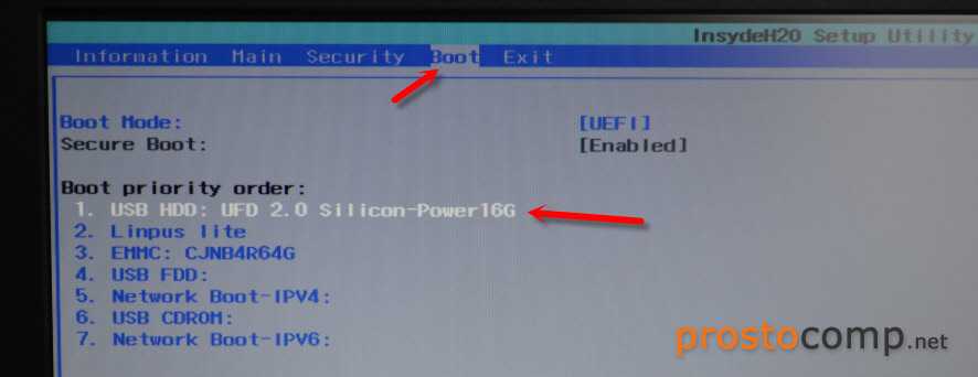 Если вы решили делать это через БИОС, то сначала нужно войти в BIOS и в разделе «Boot» поставить на первое место наш USB-накопитель. Примерно вот так: