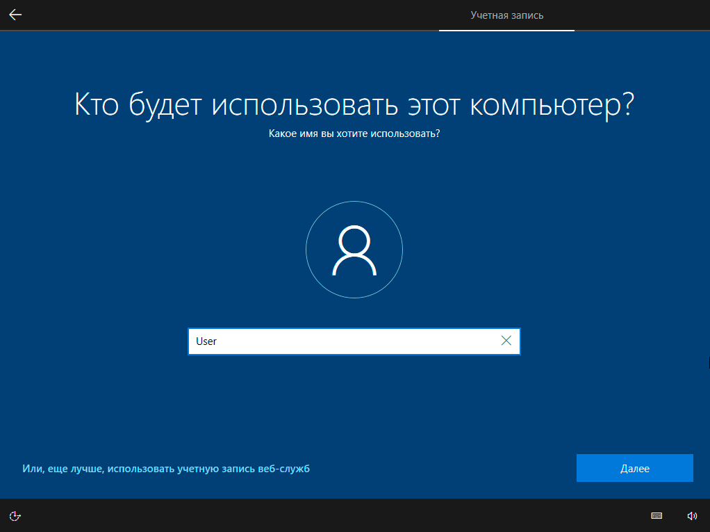 Первый и второй варианты настройки сети приведут нас к этапу настройки имени пользователя. Здесь необходимо ввести имя пользователя исключительно английскими буквами. При вводе имени русскими буквами возможна некорректная работа некоторых программ и игр. После ввода имени на английском языке нажмите кнопку Далее.