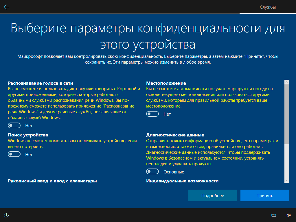 В окне выбора параметров конфиденциальности я можно смело всё отключать. Если у вас ноутбук то рекомендую оставить функцию местоположения и поиск устройства. Остальное же на ваше усмотрение, работаете с графическим планшетом, или устанавливаете систему на планшет с которым работаете пером, значит оставляйте распознавание рукописного ввода, ну я думаю логика ясна. Жмём “далее”.