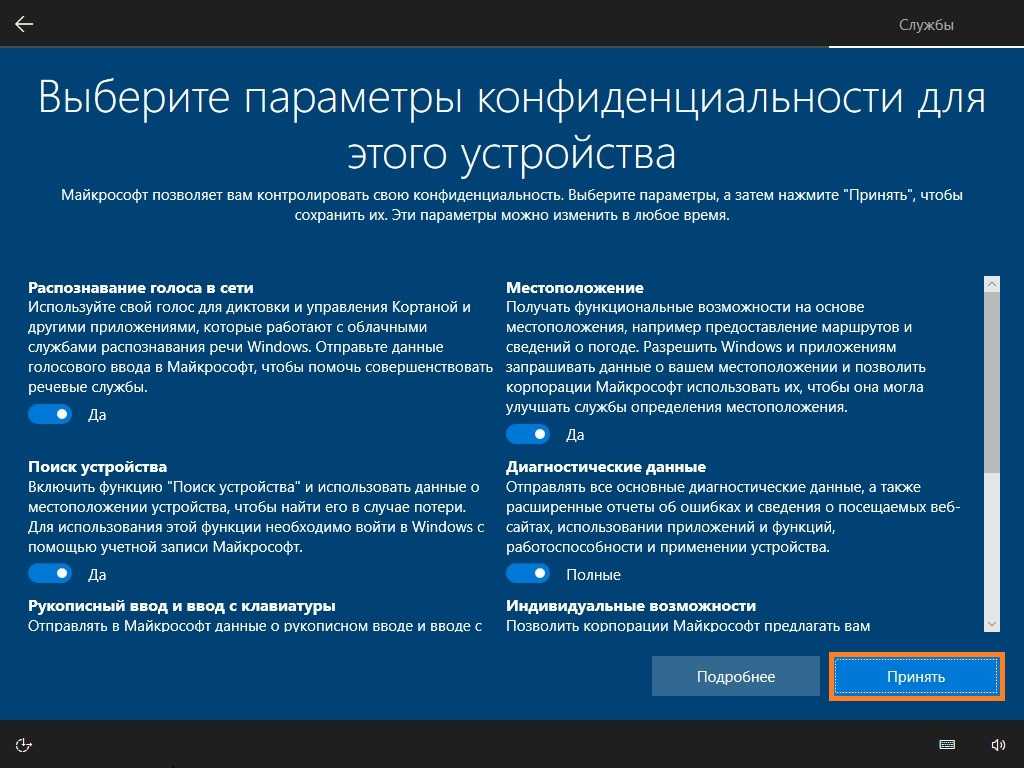 Последнее окно настройки системы — выбор параметров конфиденциальности. Настраиваем их по своему усмотрению, и нажимаем на кнопку «Принять».