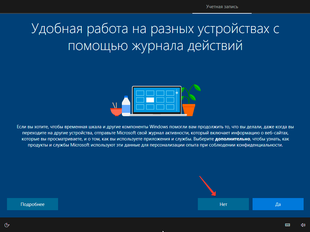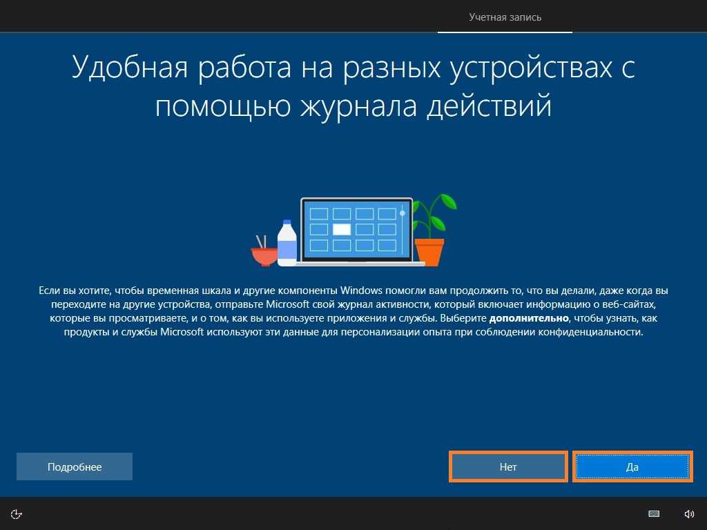 В следующем окне Microsoft предложит отправлять свой журнал активности для доступа к различным компонентам Windows, вроде временной шкалы. Выбираем «Да» или «Нет» (при использовании автономной учетной записи, данный функционал все равно будет не доступен).