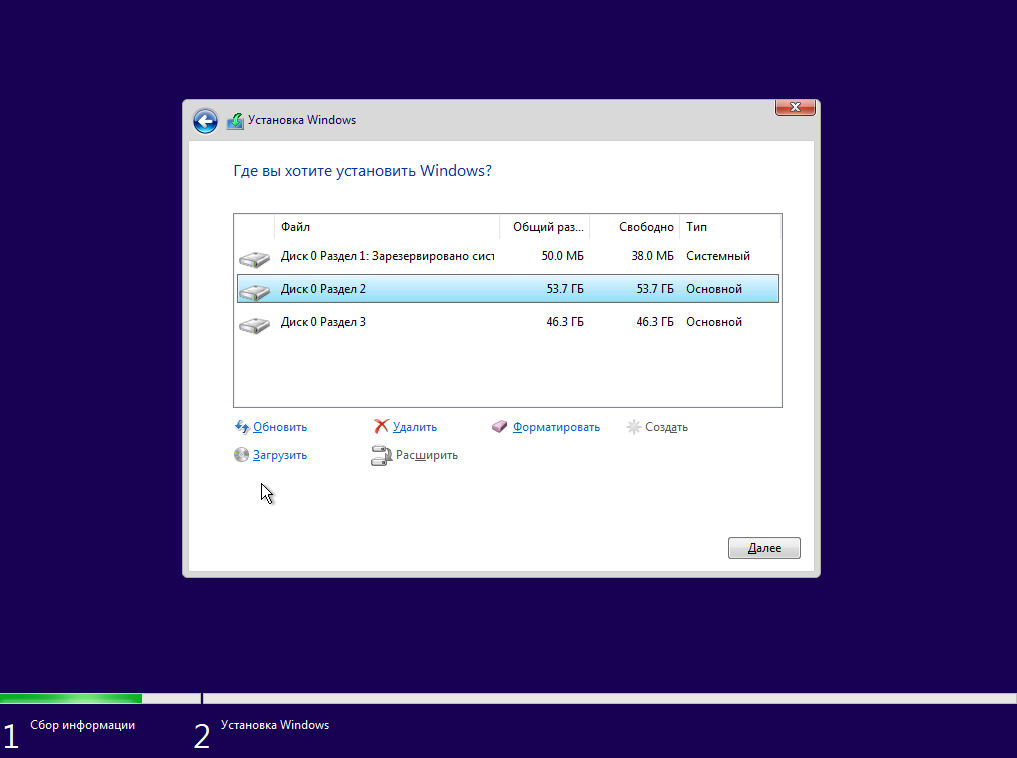 Выберите «Раздел 2», чтобы установить Виндовс на основной тип раздела (будущий диск C). Нажмите «Далее».