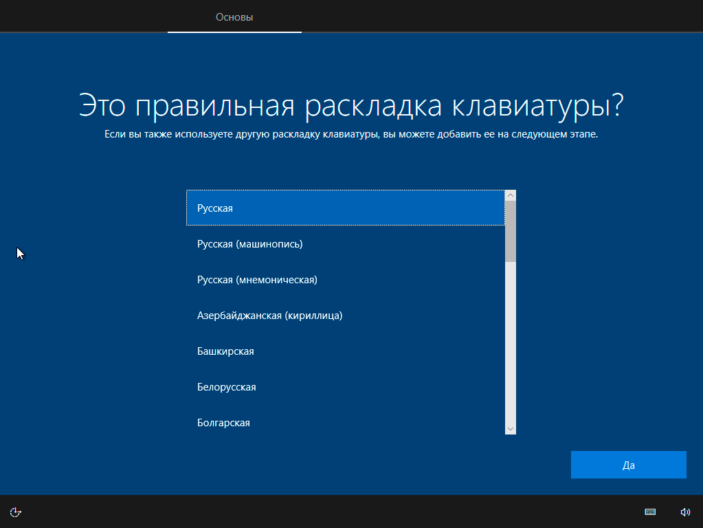 Укажите предпочитаемый вами язык. Вы можете поменять раскладку клавиатуры позже. Латинская стоит по умолчанию. Продолжите работу, нажав кнопку «Да» в правом нижнем углу экрана.