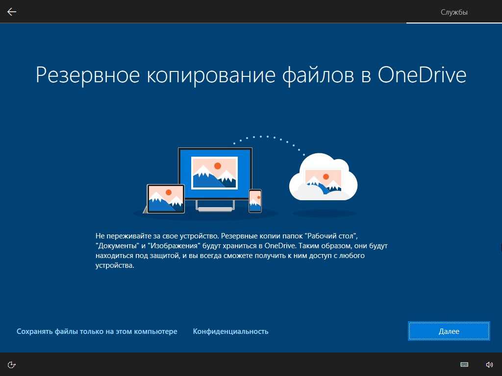 Далее, при использовании учетной записи Microsoft, появится настройка облачного хранилища OneDrive. По умолчанию, все содержимое папок «Документы», «Изображения» и «Рабочий стол» будут копироваться в облачное хранилище OneDrive. Вы можете это отключить простым нажатием на кнопку «Сохранять файлы только на этом компьютере».