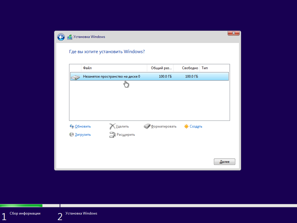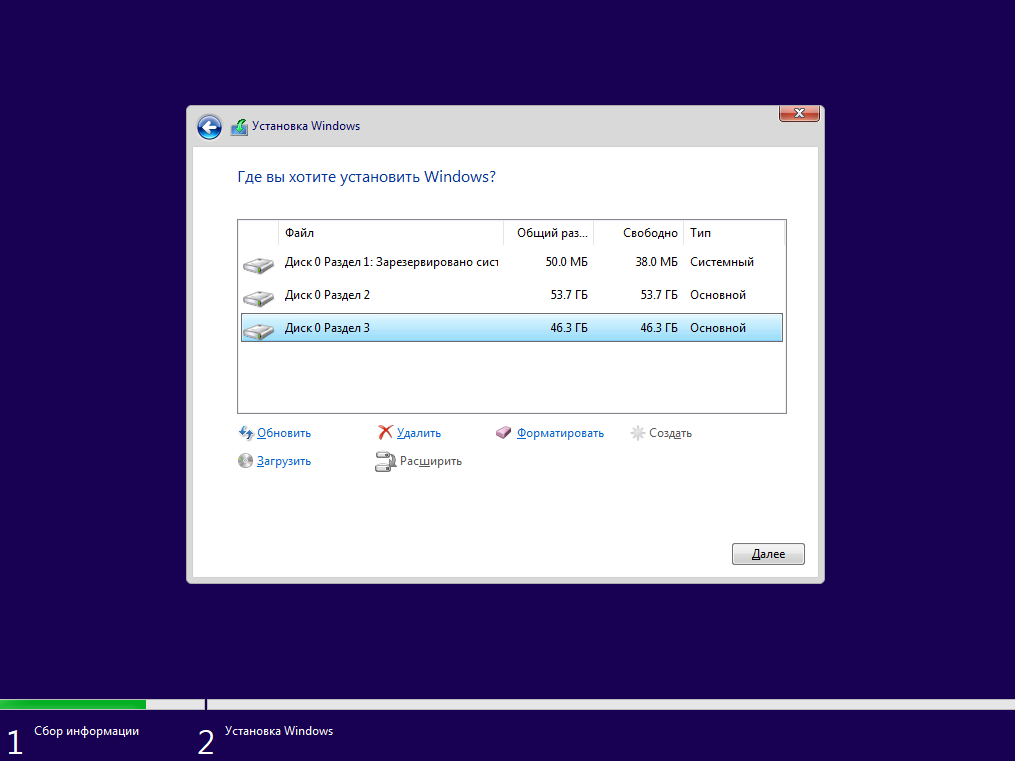 Далее появится список разделов. Для установки необходимо выбрать тот раздел, который соответствует локальному диску «C» отформатировать его и продолжить установку, нажав кнопку «Далее».