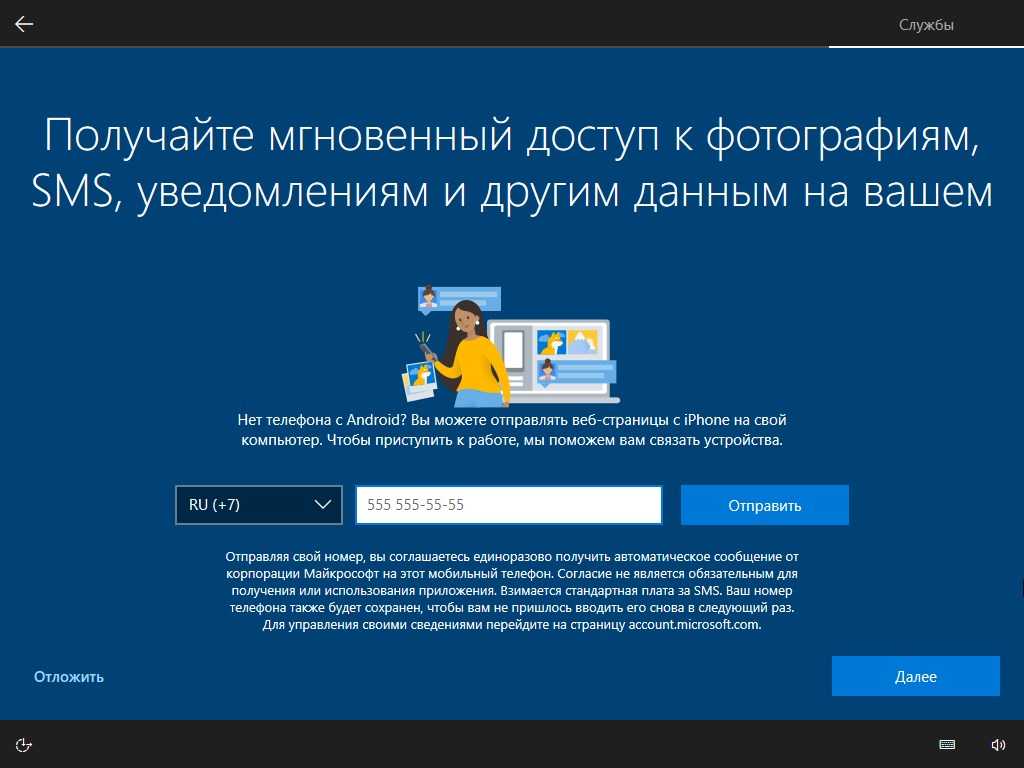В случае использования учетной записи Microsoft, далее Вам будет предложено привязать свой мобильный телефон к учетной записи Microsoft. В зависимости от ваших предпочтений, Вы можете как сделать это (введя свой номер телефона), так и отказаться (нажав на кнопку «Отложить»).