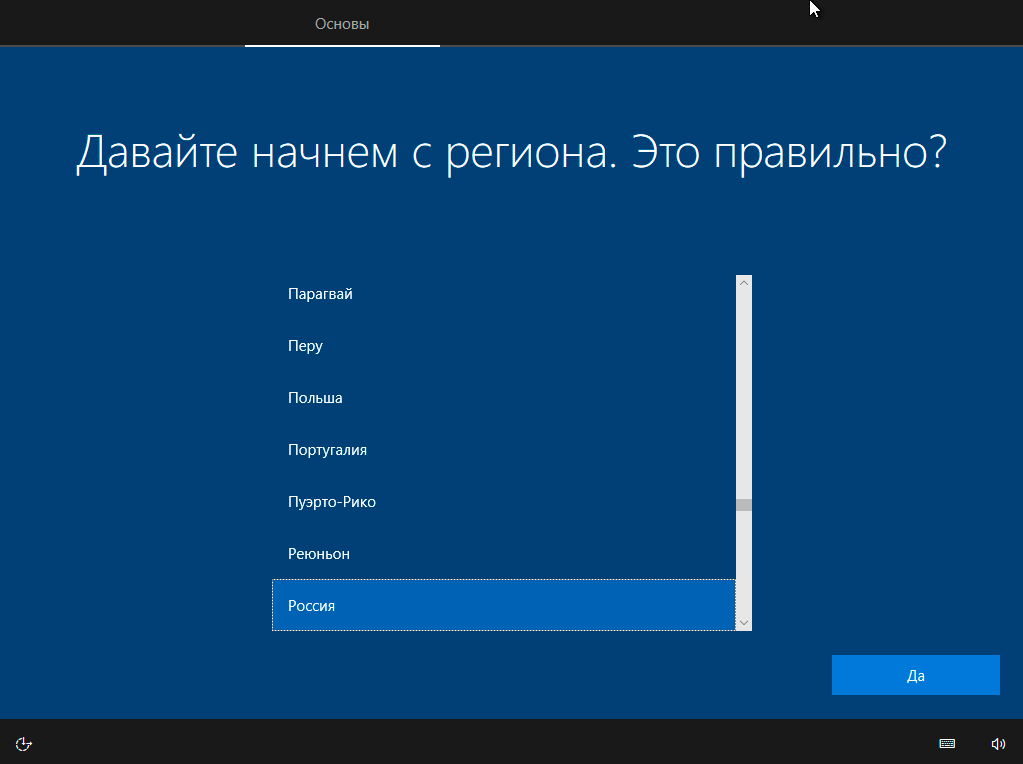 Первое, о чем нас попросит Windows – это выбрать регион. Выберем регион, по умолчанию будет выбран регион Россия. Здесь ничего не меняем и нажимает кнопку Да.