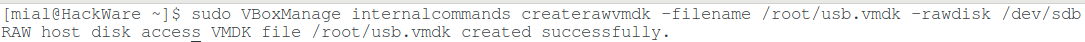 sudo VBoxManage internalcommands createrawvmdk -filename '~/VirtualBox VMs/usb.vmdk' -rawdisk /dev/sdb