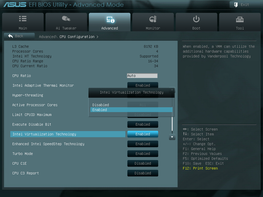 Для запуска виртуальной машины VirtualBox требуется 64-разрядная система, поддержка аппаратной виртуализации и необходима активация технологии «Intel Virtualization Technology» или «AMD Virtualization Technology» в БИОСЕ материнской платы.