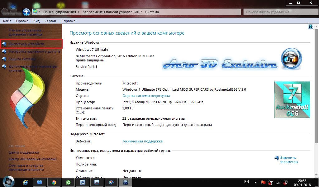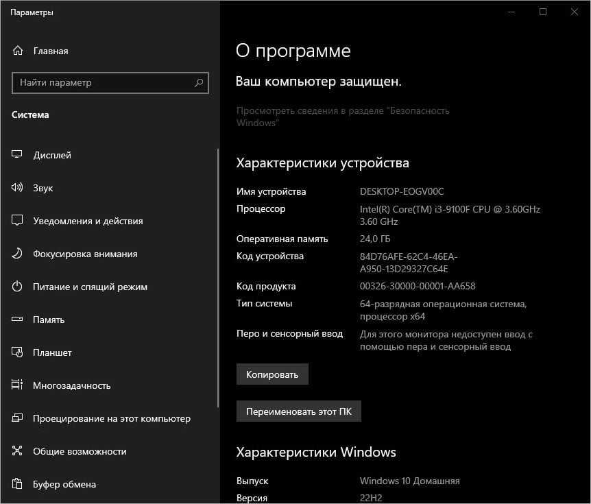 » можно увидеть основные характеристики своего ПК. А именно: версию операционной системы, модель и частоту процессора, а также объем оперативной памяти.