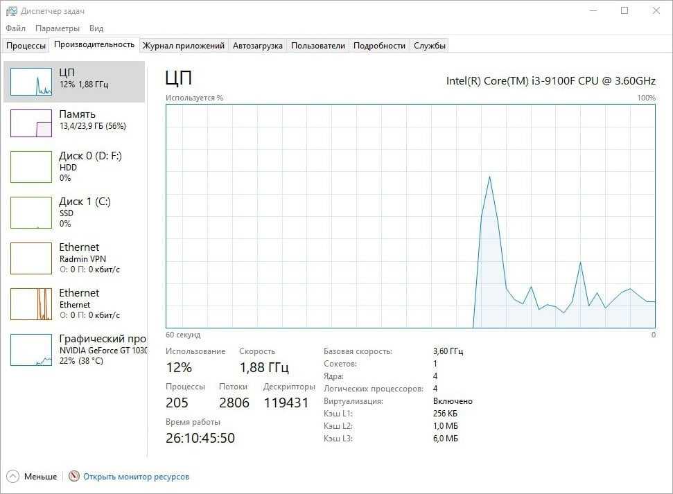 Правой кнопкой мыши кликните на панель задач и выберите «Диспетчер задач». В открывшемся окне найдите подокно «Производительность», на котором в виде графиков будет показано текущее состояние системы и краткая информация о ней.
