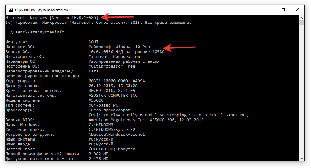 Сведения о системе можно узнать и через командную строку. Уже при запуске этого инструмента наверху вы можете увидеть версию Windows. Если набрать «systeminfo» и нажать Enter, появится еще целый ряд полезных параметров.
