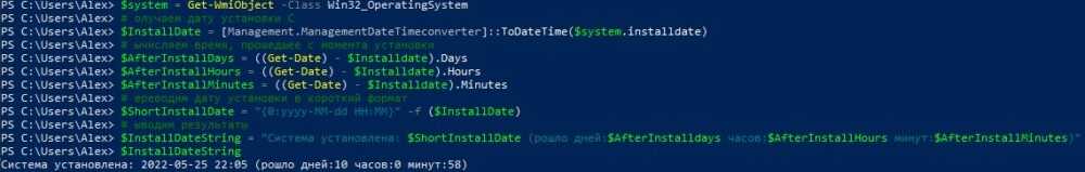 $InstallDateString = “Система установлена: $ShortInstallDate (Прошло дней:$AfterInstalldays часов:$AfterInstallHours минут:$AfterInstallMinutes)”