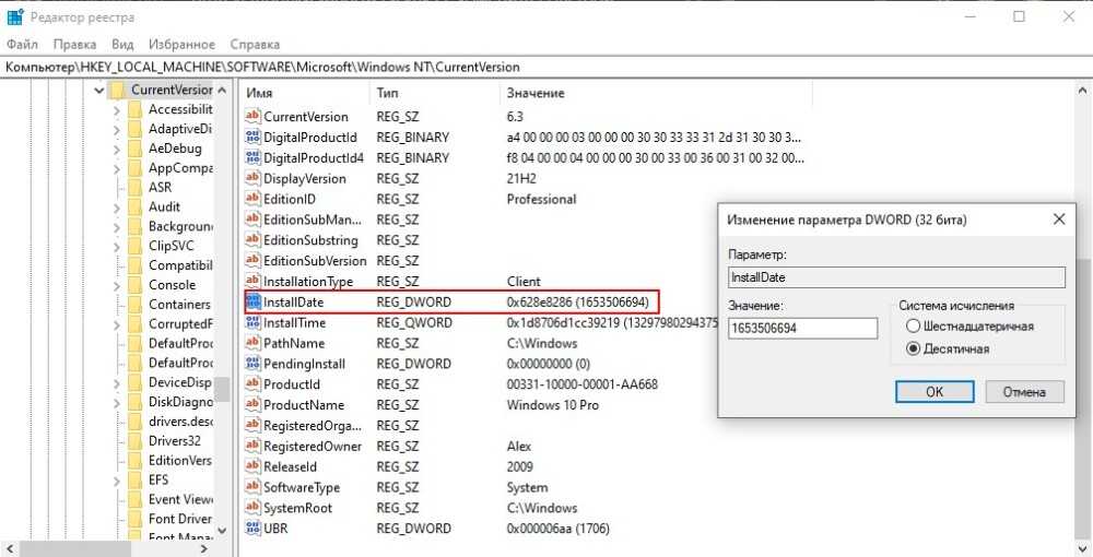 Оригинальная дата установки системы хранится в параметре InstallDate и представлена в Unix-формате. Проще говоря, значение параметра вычисляется как количество секунд, прошедшее между 01.01.1970 (начало эпохи Unix) и датой установки.