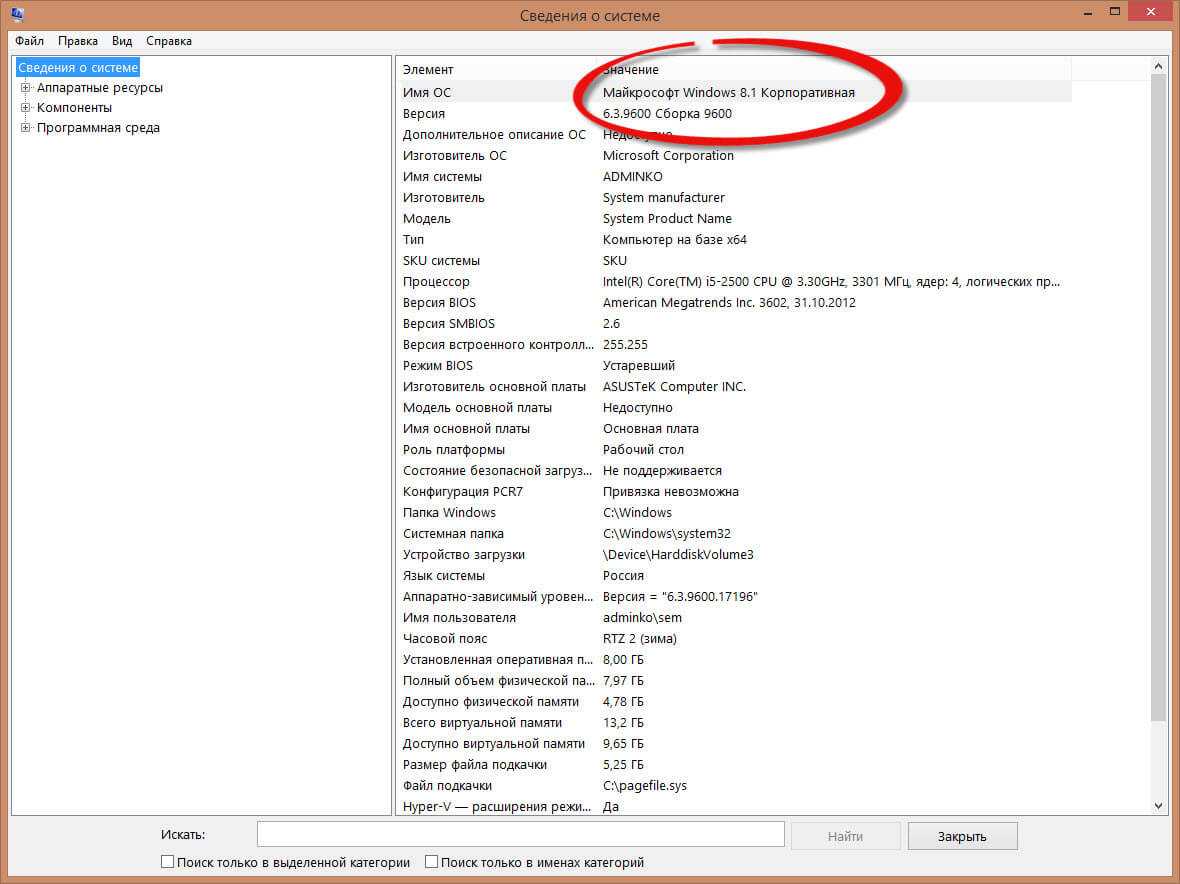 В открывшемся окне смотрим справа Имя ОС и обратите внимание есть поле версия, в моем примере это 6.3.9600 Сборка 9600