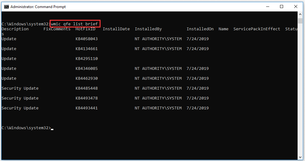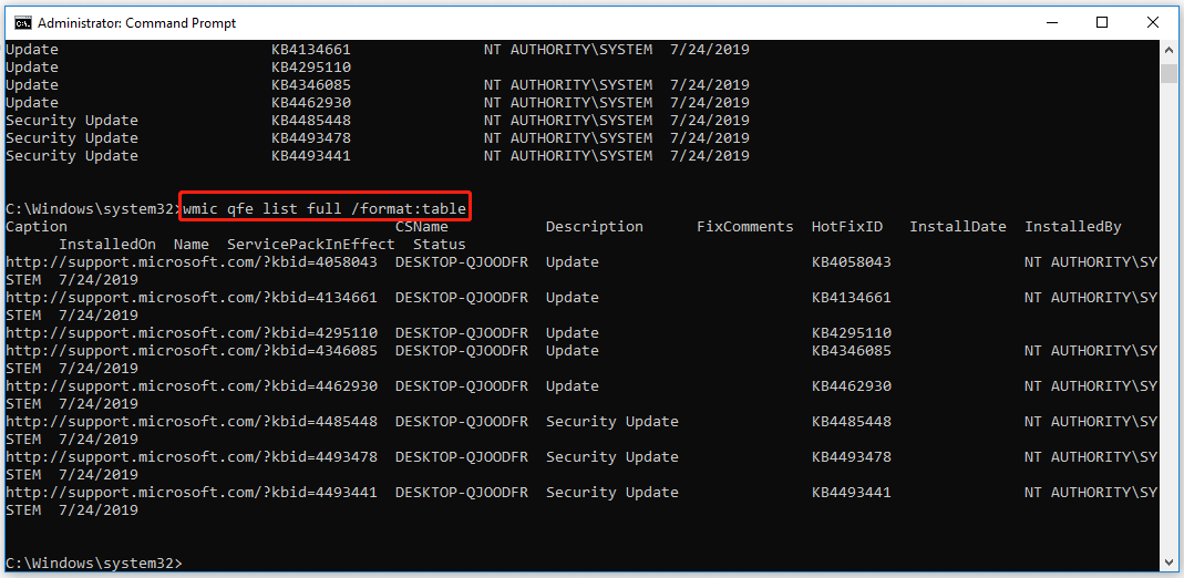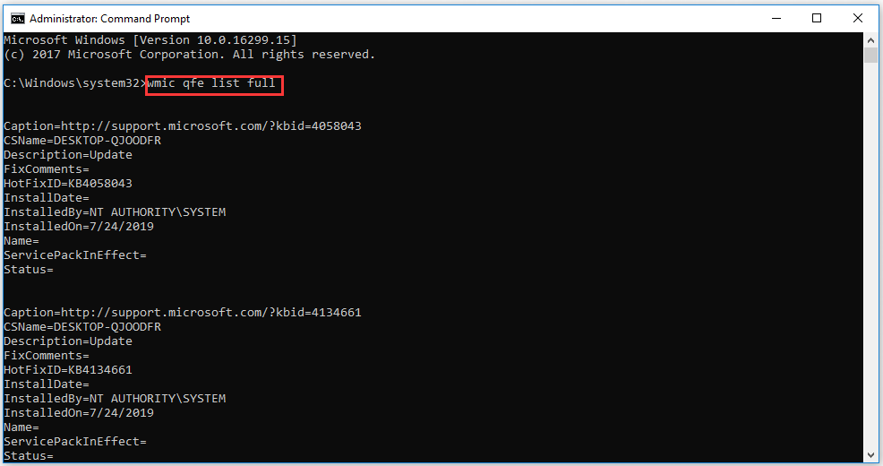 Step 2. Type wmic qfe list full command to get all information about each hotfix installed on your computer.