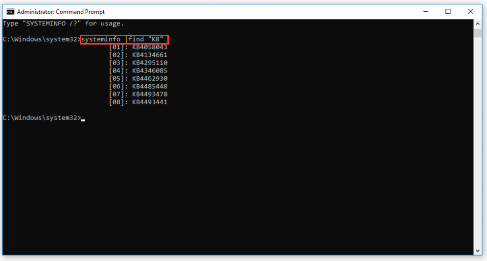 Step 2. Input systeminfo | find “KB” command and hit Enter button. Then you will see all Windows 10 knowledgebase updates number listed.