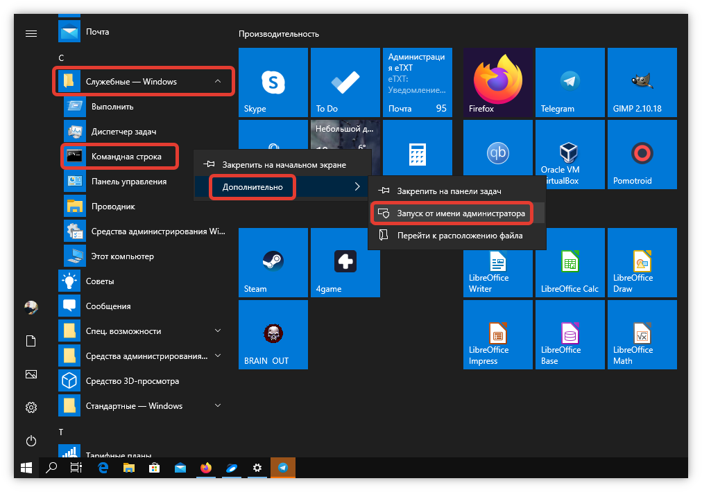 - Нажать по утилите «Командная строка» правой кнопкой мыши.