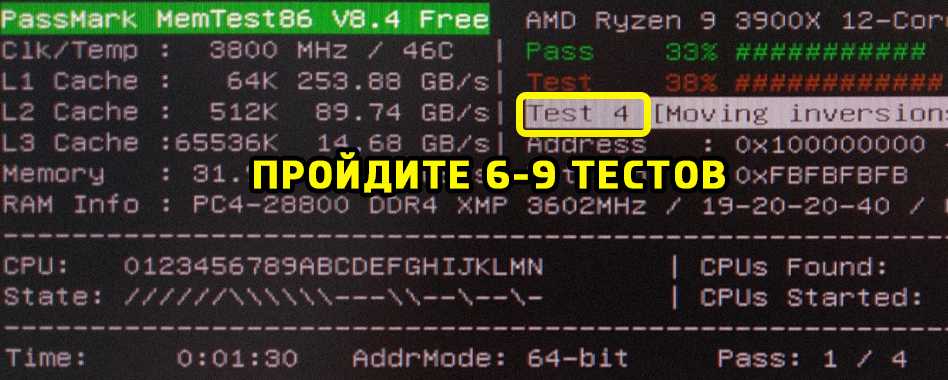 - Как только программа запустится, вам ничего жать не придется. Тестирование будет проходить постоянно по циклу, поэтому в конце вам нужно самостоятельно нажать на кнопку Esc, чтобы все закончилось. Нужно пройти как минимум 6 тестов. Если у ОЗУ будут какие-то ошибки, вы их увидите ниже – они будут подсвечены красным.