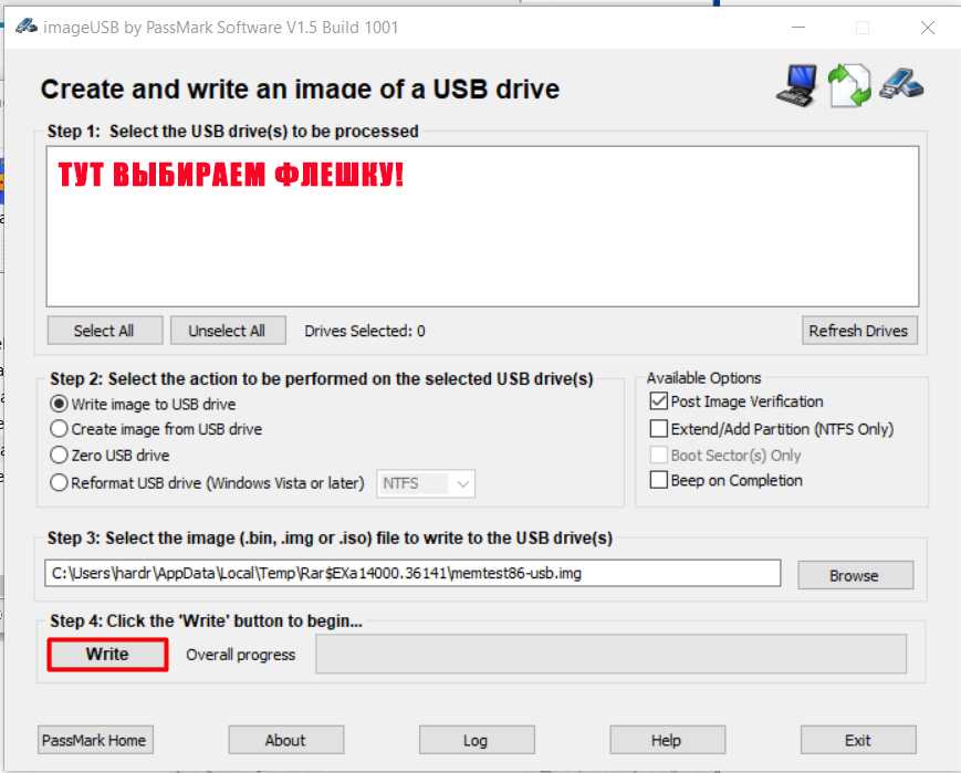 - В первом шаге выбираем вашу флешку. Если вы её не видите, нажмите по кнопке «Refresh Drivers». В конце жмем «Write».