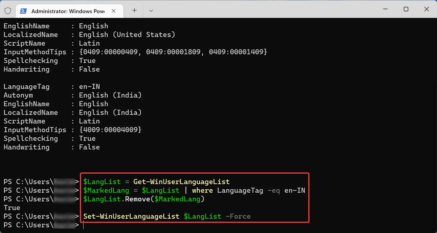 - Например, если вы хотите удалить макет с LanguageTag как en-IN, четыре команды станут следующими: