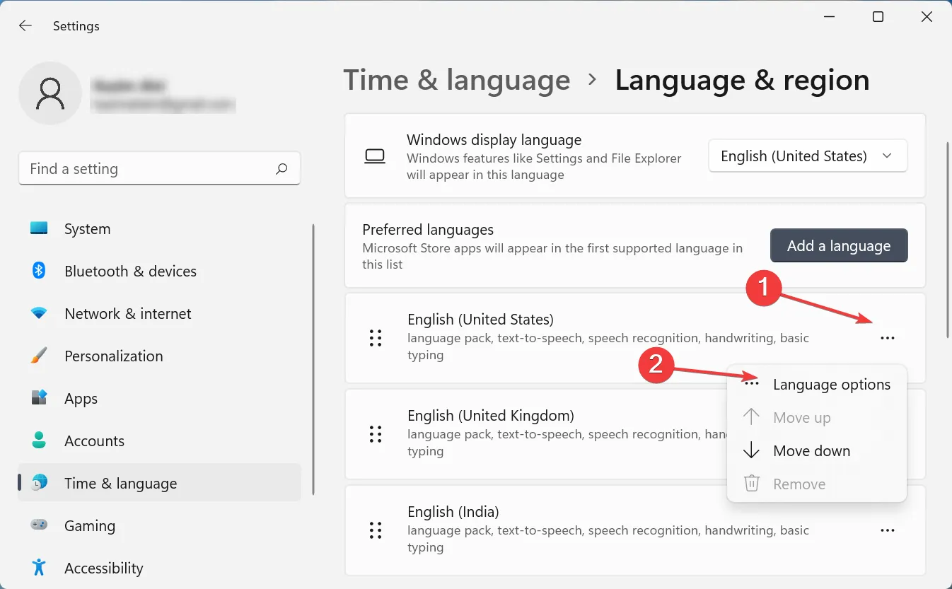 Теперь щелкните многоточие рядом с языком, на котором отображается раскладка, которую вы хотите удалить, и выберите «Параметры языка».