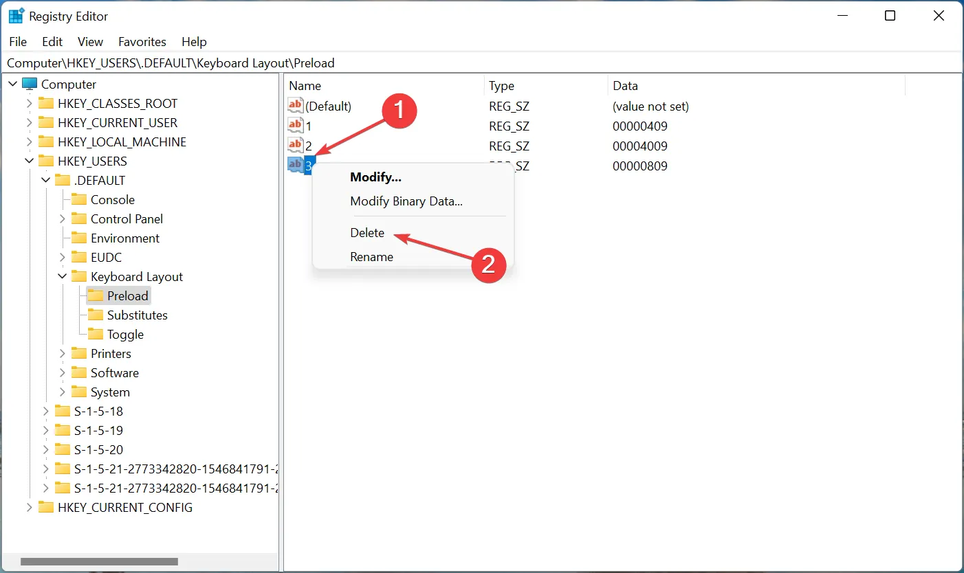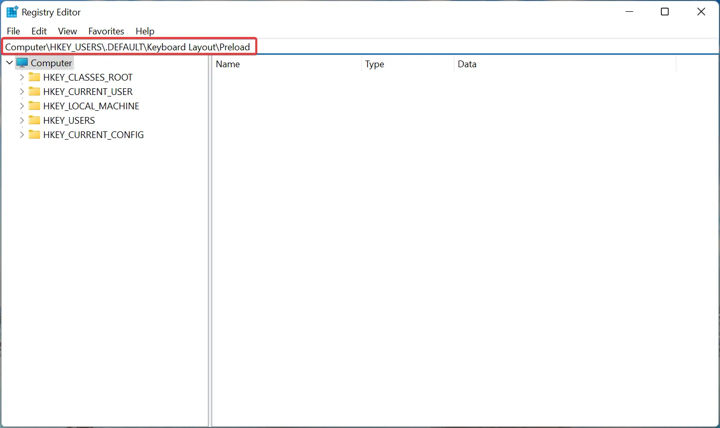 Теперь вставьте следующий путь в адресную строку вверху и нажмите Enter. Кроме того, вы можете перейти к нему, используя панель слева.Computer\HKEY_USERS.DEFAULT\Keyboard Layout\Preload